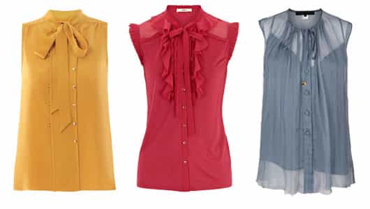 Blusas sin mangas: Este estilo es muy versátil, ya que están entre lo formal, pero cómodo. Algunas de estas blusas pueden tener cuello estilo camisa, haciéndolas más formales, y otras tienen un lazo en la parte de adelante, dándole un toque más chic.