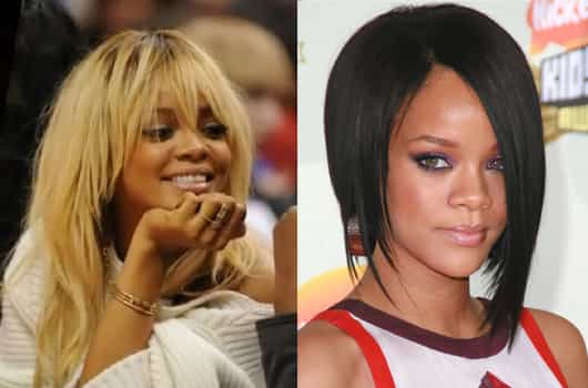 Rihanna: Siempre se destaca por sus constantes cortes de pelo. De morena se ve muy bien y le lucen mucho más sus rasgos exóticos. Ahora decidió teñirse de rubia y agregarse extensiones. A mi parecer no se ve tan linda, más bien algo desaliñada.