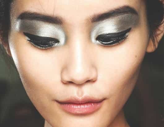 Mientras que en la noche, como tenemos más licencia para experimentar, puedes elevar esta tendencia a su máxima potencia, utilizando colores plata/acero, combinados con negros metalizados, generando impacto inmediato en tus ojos. Si lo que buscas es un efecto aún más dramático, puedes aplicarte un poco de glitter en los párpados con un pincel delgado. Recuerda que si haces esto, la sombra que utilices de base en los ojos debe ser de consistencia más cremosa, para que la purpurina se pegue.