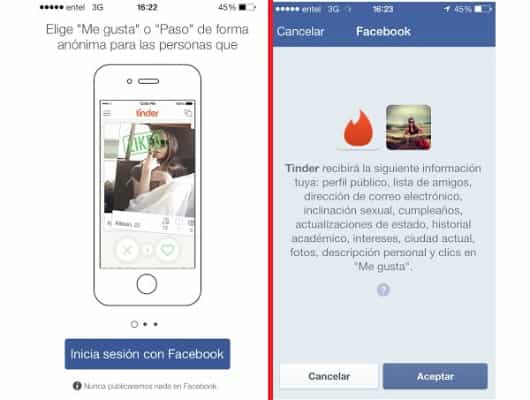 1. En primer lugar, tras instalar la app, debes iniciar sesión con Facebook y aceptar los términos de uso. Tinder rescatará alguno de tus datos personales como edad, lista de amigos o intereses, para mostrárselos al resto de los usuarios.