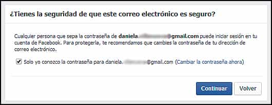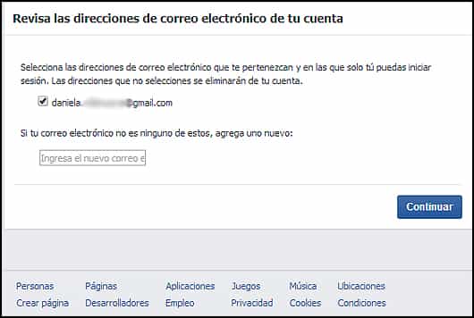 5. Al generar una nueva contraseña te piden que revises si el correo electrónico que ahí aparece es el que está correctamente ligado a tu Facebook. Si no es, puedes ingresar uno nuevo: