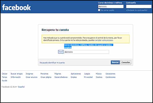 2. Luego de que haces click en "Mi cuenta está en riesgo" te lleva a otra ventana donde debes identificar tu cuenta ya sea con tu correo electrónico, tu teléfono (si es que lo tienes registrado), tu nombre de usuario o el nombre completo.