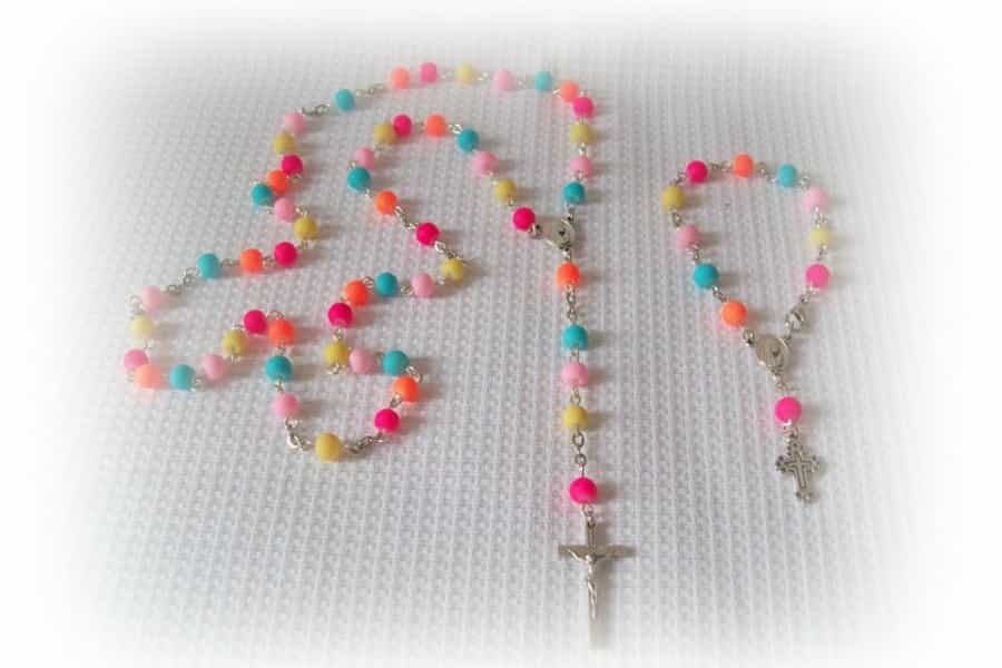 Pues bien, lo cierto es que por estos días es posible ver numerosos y multicolores rosarios en las calles, como accesorio personal femenino o a la venta en algún negocio. Seguro ha llamado tu atención cuán amplia es la oferta de estos objetos, la que además incluye denarios (sólo una serie de Avemarías, no 5) con el rojo y azul brillante como los tonos que más repiten.
