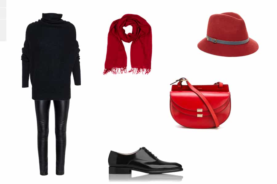 En una monocromía de negro puedes jugar con las piezas y los accesorios, proporcionándote un sinfín de combinaciones que disfrutarás tanto cuando vayas a la oficina como cuando te juntes con tus amigas. En este ejemplo, incluí el marsala, que es el color del 2015. Pero tú podrías - con otros pantalones - incluir unas hermosas botas de agua en tu tono favorito o en vez de una bufanda, agregar un maxi collar.