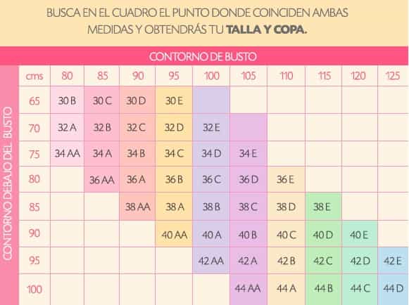 Lo mejor que podemos hacer para salir de las dudas es medirnos. Para saber la talla del contorno, debemos medir el tórax, justo debajo del busto. La copa se determina atendiendo al contorno del busto en su parte más grande. Luego, con los resultados buscamos en la tabla y sabremos qué talla nos corresponde, evitando no sólo malos ratos, si no que ayudando a nuestra espalda.