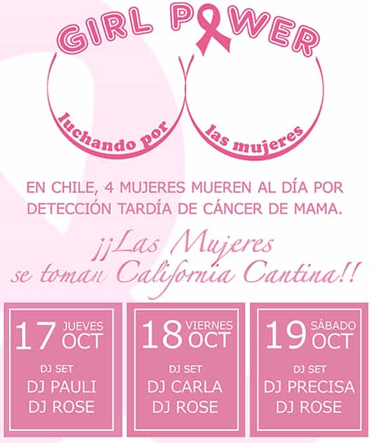 CALIFORNIA CANTINA quiere apoyar la investigación y tratamiento del cáncer de mama en Chile. Una mujer muere cada 8 horas en nuestro país por esta enfermedad. Es por eso (y pensando en la salud de nuestras abuelas, mamás, esposas, hijas, hermanas y amigas) que California Cantina dedicará todo el mes de octubre a recaudar fondos para CONAC, Corporación Nacional del Cáncer, mediante la venta de sus cocteles de happy hour. Además, los días 17, 18 y 19 de octubre se celebrarán tres fiestas a beneficencia, bajo el concepto GIRL POWER, donde lo recaudado por las entradas, como de la venta de tragos especialmente pensados para la ocasión, irán en ayuda de la Corporación. De esta manera, no sólo estarás pasando un gran momento, sino que también estarás apoyando una buena causa, fomentando el autoexamen de prevención y generando conciencia sobre el cáncer de mama. Habrán sólo DJ’s Mujeres tocando música electrónica y ultra bailable como también venta de merchandising con el logo de la campaña que serán donados en un 100% a CONAC. La entrada será gratuita hasta las 23:00 hrs. Luego, hasta la 1:00 de la mañana tendrá un valor de $3.000 y, más tarde costará $5.000. Si vas de rosado y podrás entrar toda la noche por sólo $2.000. California Cantina está ubicado en Providencia: Las Urbinas 44 y 56. Reserva tu mesa al +56 9 822 382 98 o bien escribe a reservas@californiacantina.cl Te invitamos a seguir todas las novedades a través de sus redes sociales TW @californiacanti y en FB California Cantina o visita nuestra web www.californiacantina.cl