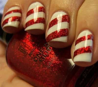 Es un típico dulce de navidad y súper fácil de dibujar. Como consejo, utiliza cinta adhesiva para crear las lineas. Usa la base blanca, deja secar y luego tapa con cinta las partes que no pintarás con rojo (con o sin brillos).