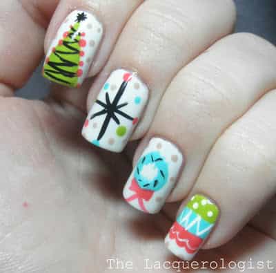 Trata de escapar de los típicos colores navideños; intenta con tonos que han estado de moda toda esta temporada y será más fácil combinarlos con tu ropa. Este diseño es muy entrete, llamativo y fácil. No posee grandes detalles y un secreto para lograrlo es utilizar una pinza de pelo (esas negritas) y con la cabeza redonda dibujar.