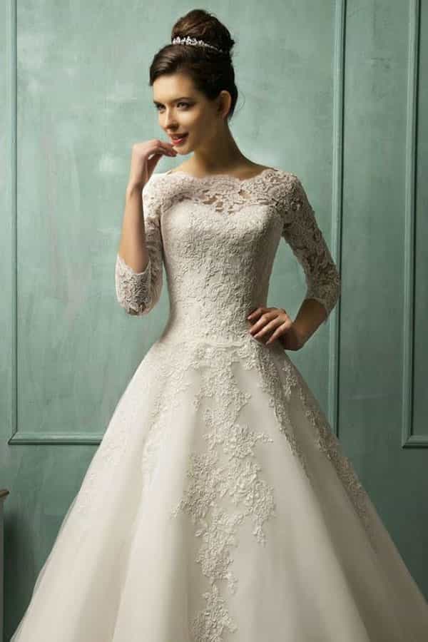Ideal si no quieres agregar ninguna otra prenda sobre tu vestido. Las mangas pueden ir de encaje y reposar la atención en ellas, o simplemente ser lisas, generando un escote más amplio para compensar la piel tapada. Si tienes los brazos un poco anchos, ojalá que las mangas no sean muy apretadas. Nuestro vestido de novia debe favorecernos.