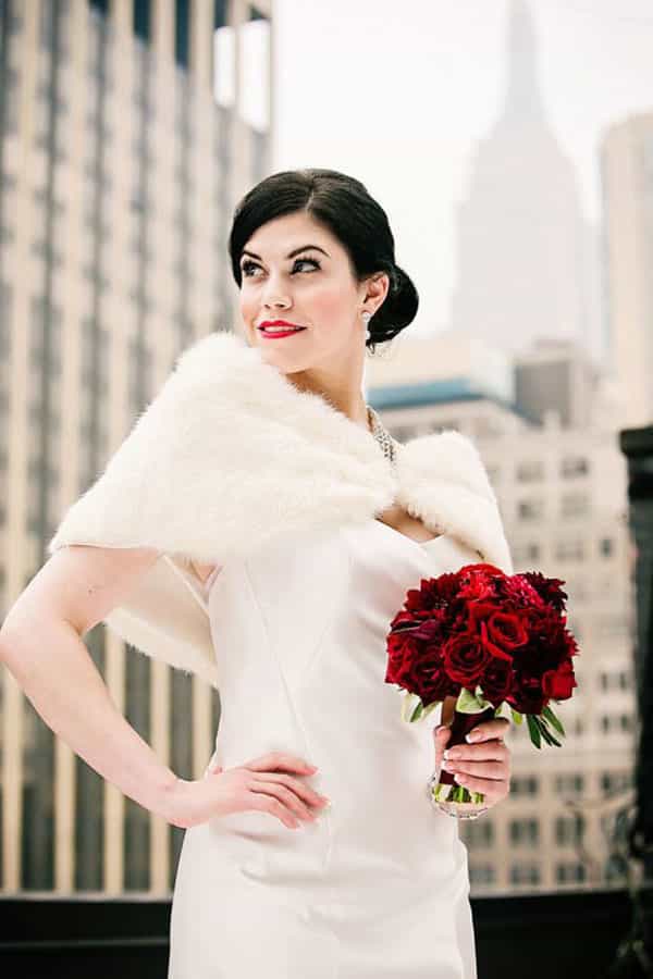 Si crees que un abrigo puede opacar demasiado tu vestido de novia, entonces debes considerar el bolero. Corto, te cubrirá sólo espalda y hombros, permitiendo que luzcas el vestido completo. Puede ser de un material diferente, peludo como el de la foto, de encaje u otro género. Al ser más pequeño, puedes jugar mucho más con el diseño y textura, a diferencia de un abrigo que cubra el atuendo completo.