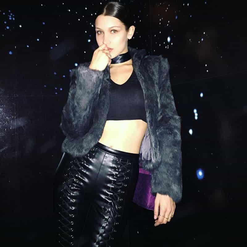 Otra alternativa es usar los cortes en la parte delantera del pantalón, en lugar de los costados. El modelo de cuero es otro favorito de las Hadid y las hemos visto luciendo espectaculares en él varias veces. Estilos similares al de la foto se encuentran en ASOS y Pretty Little Thing.