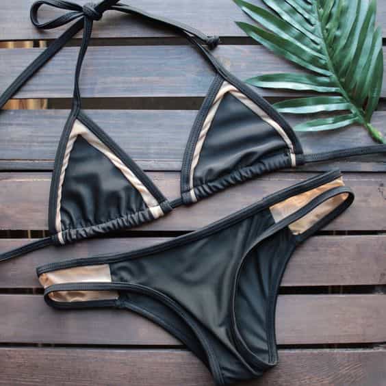 Bikini triángulo: otro diseño complicado, a pesar de lo común que es. Aquí presentamos dos tipos de bikini triángulo: si se fijan, el primero tiene los triángulos fijos, mientras que el otro puede ajustarse. Este último es el modelo menos sentador, puesto que las lolas no quedan bien sujetas y requiere estar acomodándolo constantemente.